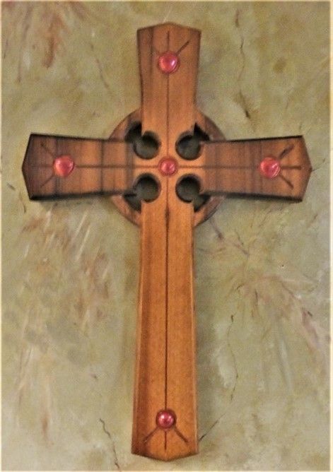 The crosses and Christian symbols were produced to be decorative as well as educational – to increase knowledge of Christian history. Seven of the crosses were made from cherry wood. Due to the nature of the wood and the finish used, they will probably darken as they age.